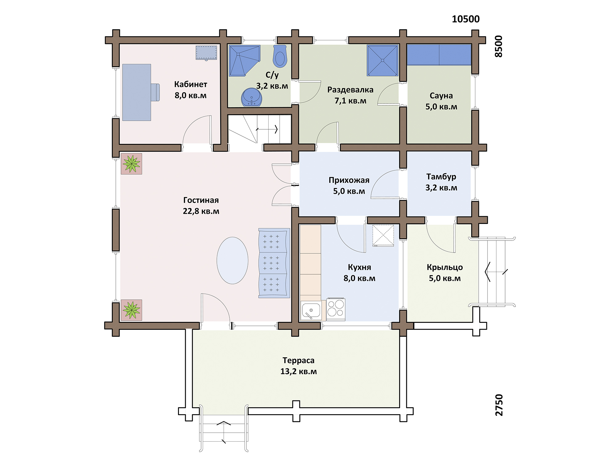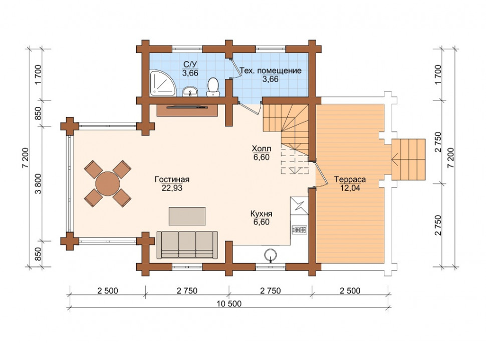 - Размеры: 7.2 x 10.5 м.