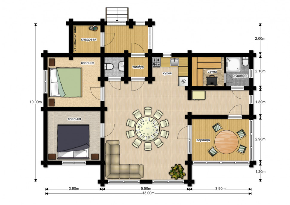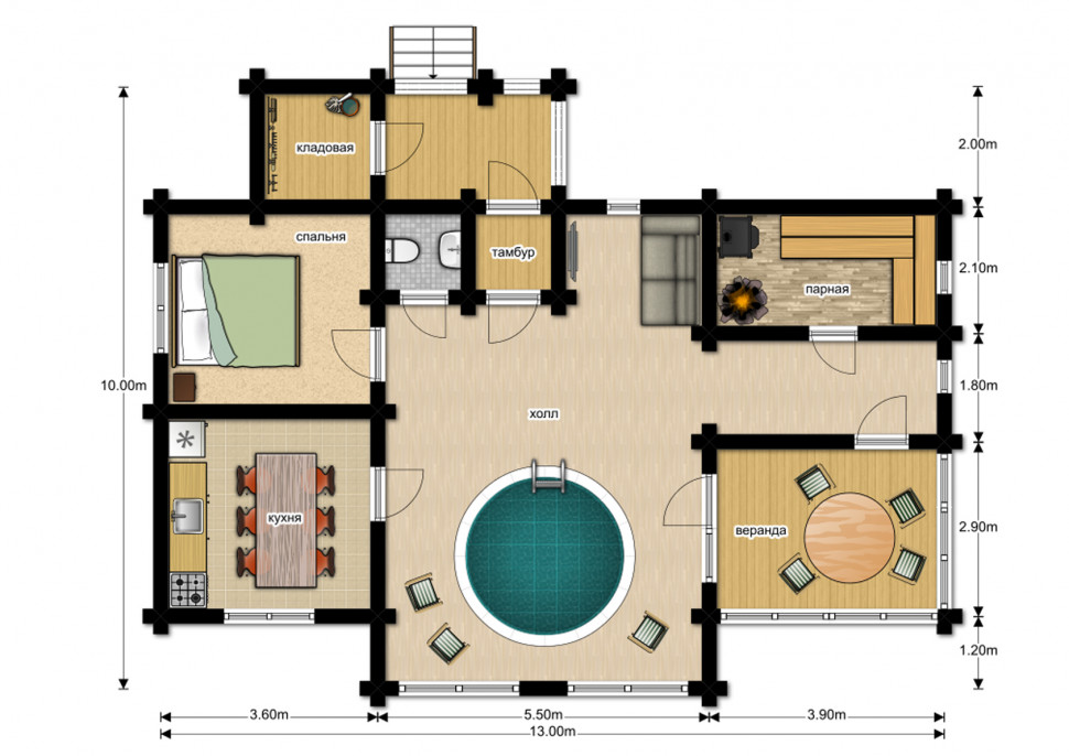 - Размеры: 10 x 13 м.